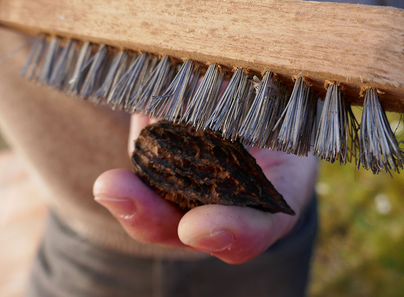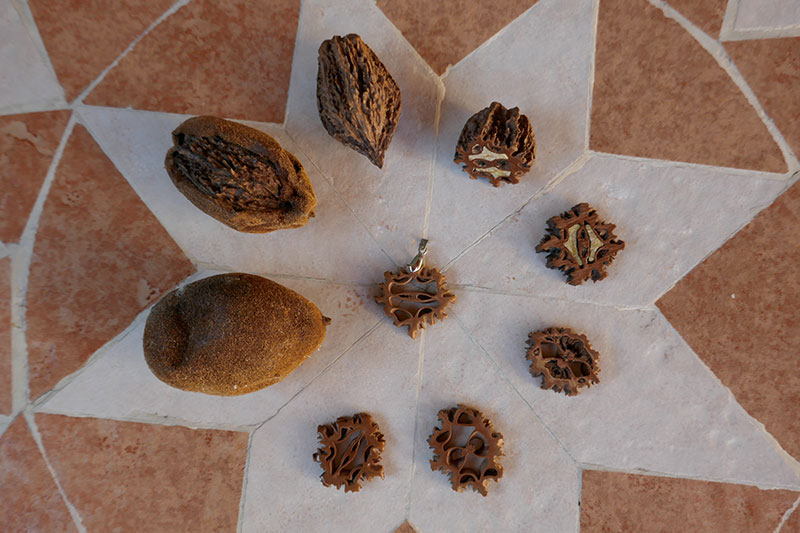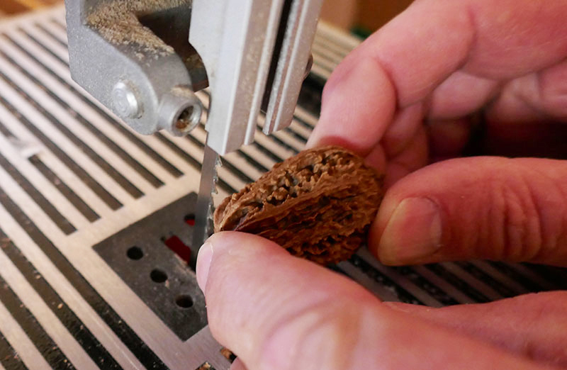 Rohling herstellenIm ersten Schritt wird die Schale abgeschält und die Nuss mit einer Drahtbürste von den Schalenresten gereinigt. Anschließend wird die Nuss auf einer Bandsäge in gleichmäßige Scheiben geschnitten. Danach wird der eigentliche Nusskern mit einem kleinen Holzstäbchen herausgedrückt. Mit einer kleinen Bürste müssen nun noch die kleinen Häute in den Zwischenräumen entfernt werden. |