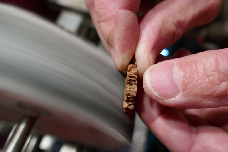 Schleifen & PolierenUm dem Schmuckstück nun einen schönen Glanz zu verleihen, werden die einzelnen Scheibchen mit immer feiner werdendem Schleifpapier geschliffen. Beim abschließenden Polieren mit verschiedenen Polierscheiben werden die Kanten extra abgerundet. Polierrückstände werden mit einem Dampfreiniger entfernt und mit einer Wabbelscheibe final poliert. Durch diese Vorgänge erhält die Nuss einen besonderen Glanz, sodass auf zusätzliche Versiegelungen wie Wachs, Lack oder Öle verzichtet werden kann. Natur pur! |