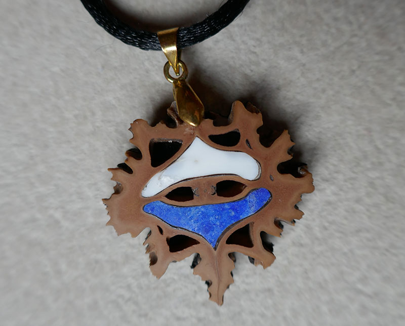 VeredelnDurch Anbringen von Kollierschleifen, Ohrhänger oder Stecker wird aus der Nuss das eigentlich Schmuckstück. Zusätzlich werden nach Bedarf oder Sonderwünschen Halbedelsteine oder Edelsteine eingesetzt. Dazu stelle ich verschiedenfarbige Halsbänder in unterschiedlichen Längen aus Einzelteilen zusammen. Die gehäkelten Kropfbänder werden von einer befreundeten Künstlerin gestellt und die Nuss mit polierten Ebenholzplättchen auf der Rückseite so befestigt, dass sie verschiebbar ist. |